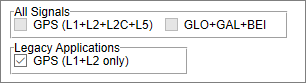 At the bottom of the screen, check the boxes for the satellite constellations your receiver supports (GPS, GLONASS, Galileo, QZSS, SBAS, Beidou or IRNSS. Depending on the receiver used, your settings should now look like this (Example shows a GPS only GNSS receiver capable of receiving the L1 and L2 GNSS frequencies):