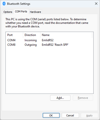 After selecting the 'More Bluetooth Options' option, a new dialog should appear containing three tabs. Select the 'COM Ports' tab. Please note that a device, like for instance our Trimble R8 receiver, can have more then one serial port.