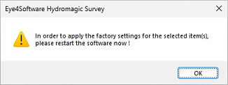 After selecting one or more options, click 'OK' to reset the selected items to factory defaults. The software will prompt you to restart the program because the settings will be restored the next time it is started.