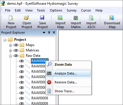 To view the data, locate the active raw data file name in the "Project Explorer", and right-click on it to open the context menu.