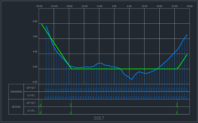 The pre-sounding will be displayed in red, the post-sounding in green, and the channel design is displayed in blue.