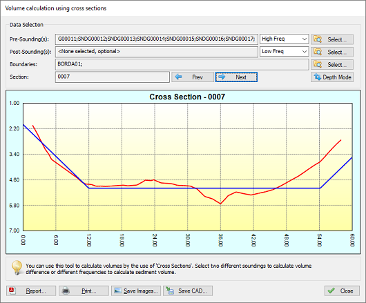 When you want to calculate the amount of sediment, select the same sounding in both input boxes, and select different frequencies. If you end up with negative values, swap the selected frequencies or the values selected in the "Pre-Sounding(s)" and "Post-Sounding(s)" fields.
