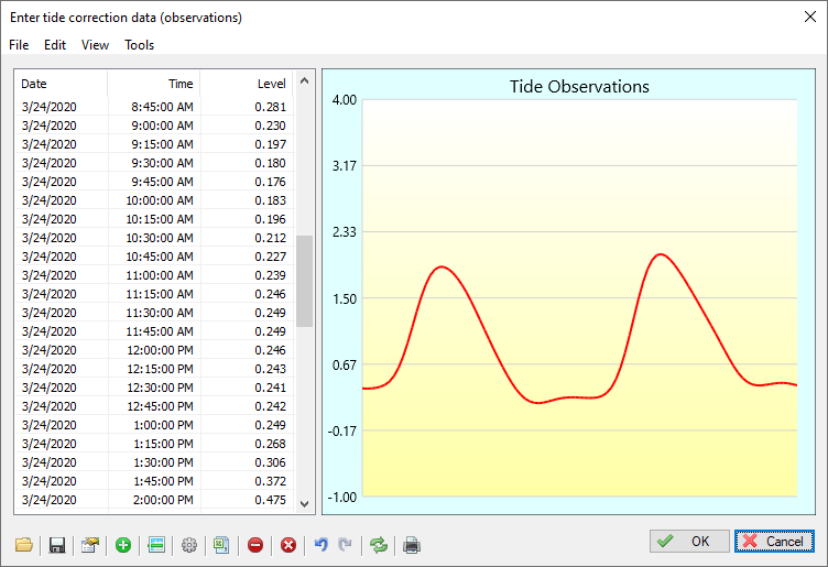 When you want to use tide corrections without special hardware such as a RTK receiver or tide gauge, select this option. It allows you to create a tide correction file where you can manually enter the tide observations made during the survey or use the tide prediction tool to generate a tide file. You can start the tide file editor by clicking the 'Editor...' button or select an existing Hydromagic tide file by clicking the 'Browse...' button.
