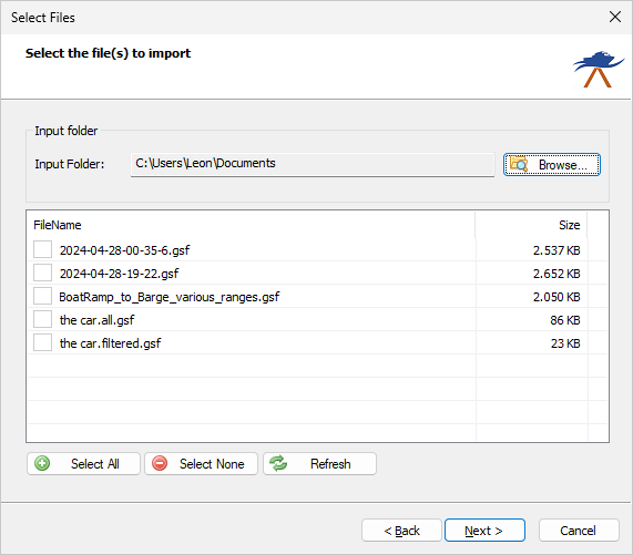 To select the files to import, you have to select in which folder they are copied. This can be done by clicking the "Browse..." button. After selecting the folder, click "OK", and Hydromagic will automatically scan for GSF files and shows them in the list: